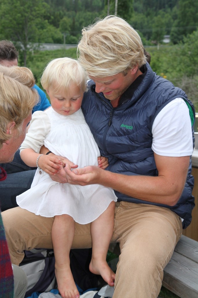 We were invited to my brother, Ole Gunnar's farm on the other side of the lake, so we decided to take the boat over ;) Liv and I had picked wild flowers and put them in a bucket of water on the way home from kindergarten, so we could make our own flower wreaths.